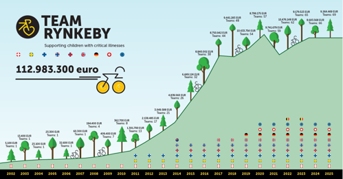 Team Rynkeby is an international charity cycling team that cycles to Paris every summer to raise money for children with critical illnesses. The cycling team has existed since 2002, when 11 exercise bike riders associated with the Danish juice company Rynkeby Foods decided to cycle all the way to the French capital to see the end of the 89th edition of the Tour de France.