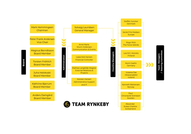 The Team Rynkeby Foundation runs the charity cycling team Team Rynkeby. The foundation consists of a board of directors and a director who, together with a country manager in each of the countries where Team Rynkeby is represented, handles the day-to-day management.
